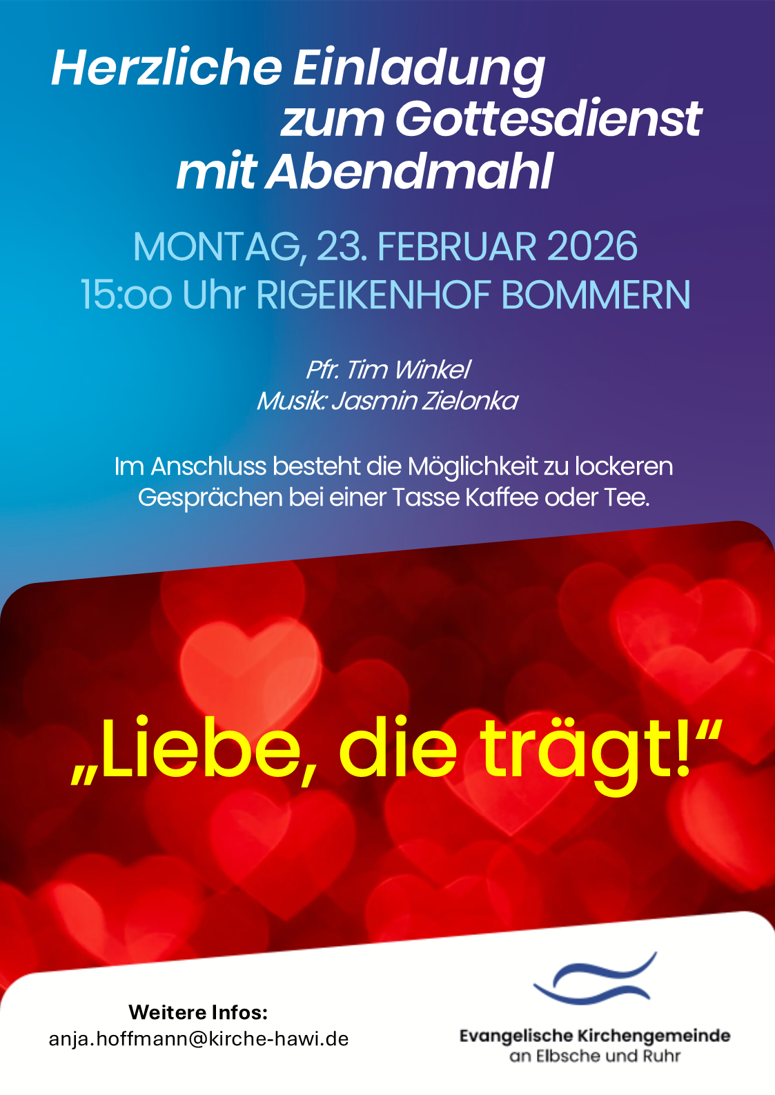 Unsere Evangelische Kirchengemeinde Bommern sieht in Verantwortung vor Gott und den Menschen ihre Aufgabe in der Verkündigung des Evangeliums in Wort, im diakonischen Handeln, in der Seelsorge und durch die Musik als universelle Sprache. Seit dem 01.01.2026 gehören wir zur Ev. Kirchengemeinde an Elbsche und Ruhr.