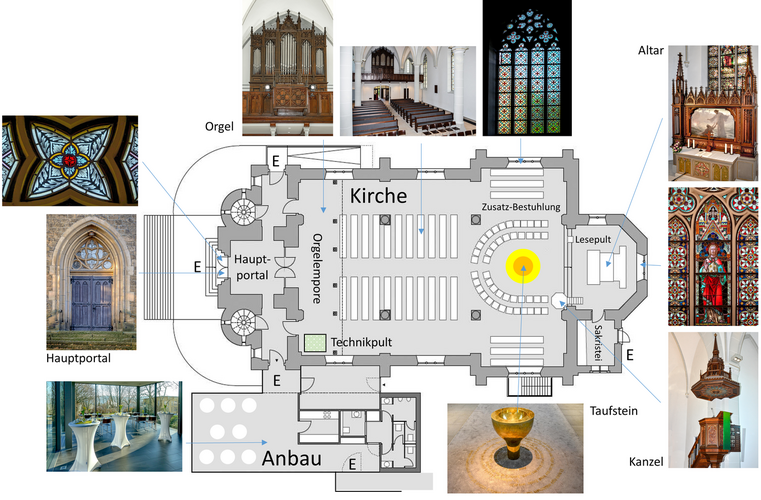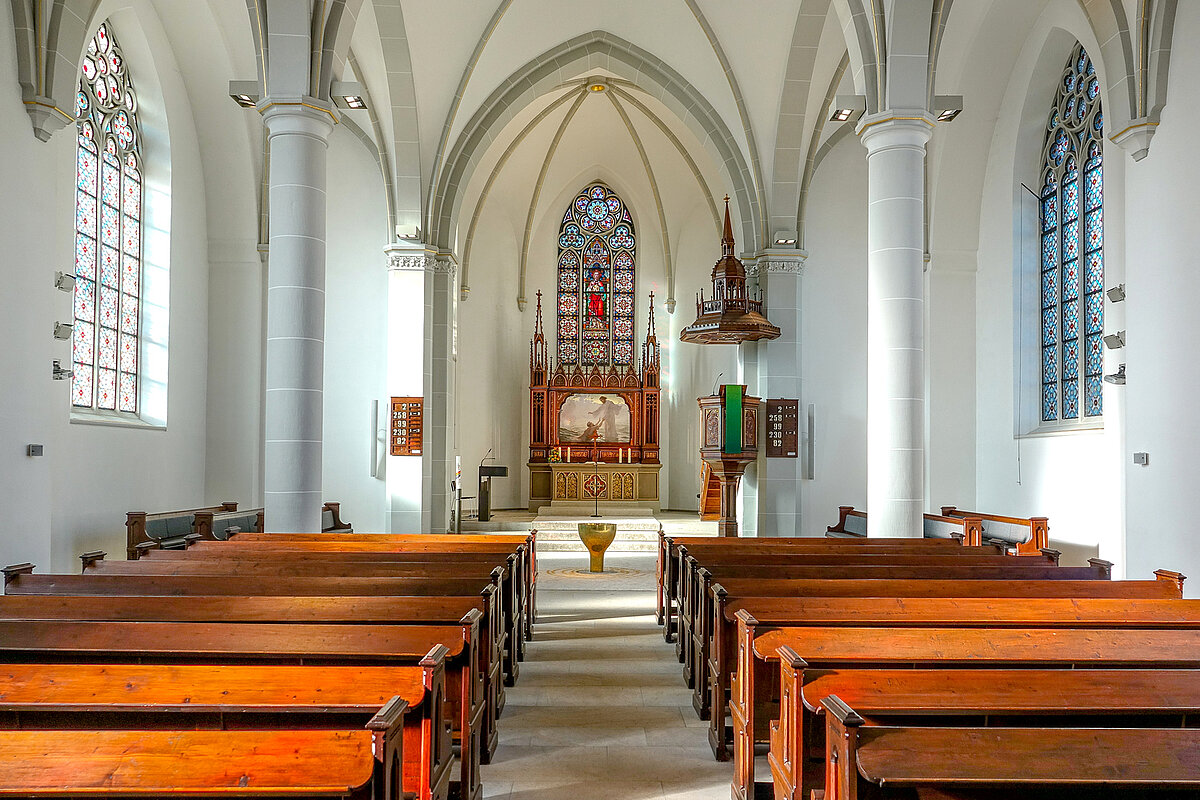 1893 wurde unsere Kirche fertig gestellt, 2013-2014 wurde sie komplett renoviert. Sie bietet Sitzplätze für etwa 200 Personen, bei zusätzlicher Bestuhlung bis zu 500 Personen. Im Eingangsbereich finden Sie Evangelische Gesangbücher zur Ausleihe für den Gottesdienst. In der gesamten Kirche gibt es eine Induktionsschleife für hörbehinderte Menschen.