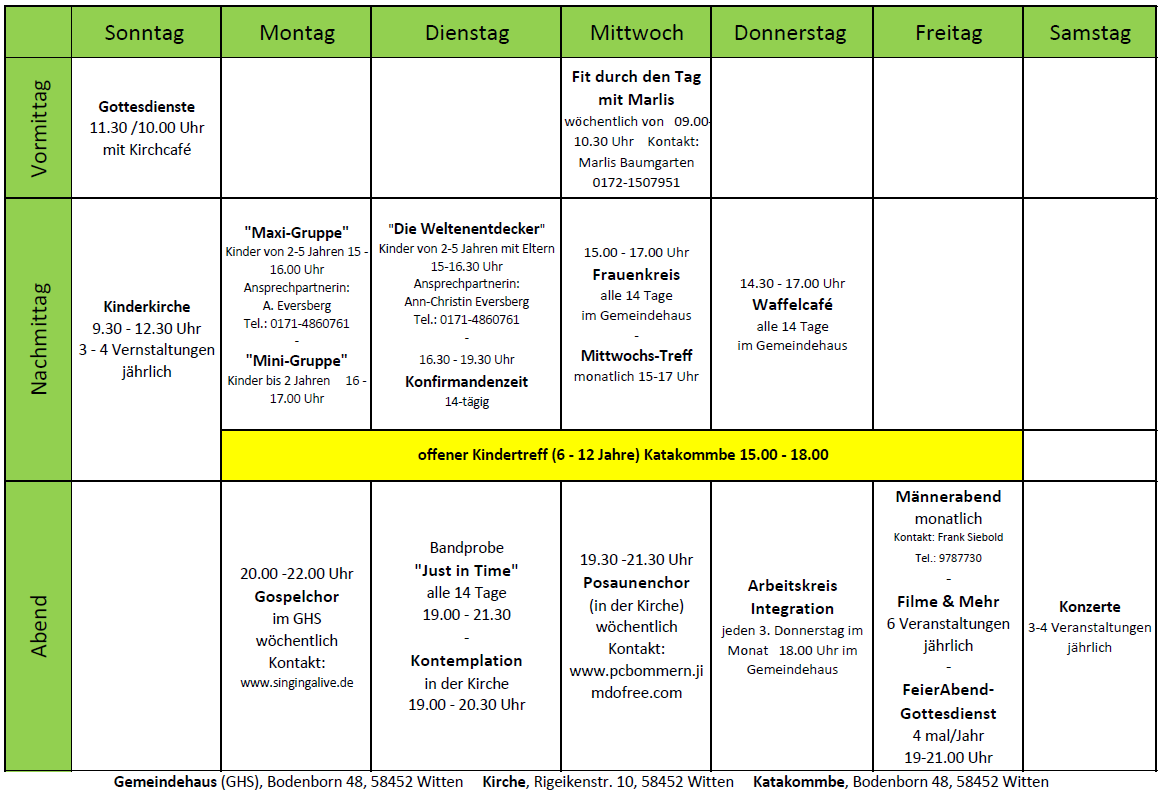 Die Übersicht zeigt nur eine kleine Auswahl der regelmäßigen Veranstaltungen. Weitere Termine, z.B. Gottesdienste in der Kirche, den Altenheimen, Chor- und Musikproben, Ökumenische Veranstaltungen etc. sowie ausführliche Beschreibungen finden Sie direkt unter "Termine" oder unter den anderen Menüpunkten (oben). Für Anregungen und Wünsche sind wir offen.